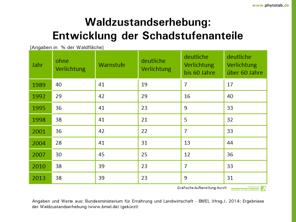 Quellen: Bundesministerium für Ernährung und Landwirtschaft - BMEL (Hrsg.), 2014: Ergebnisse der Waldzustandserhebung (www.bmel.de)