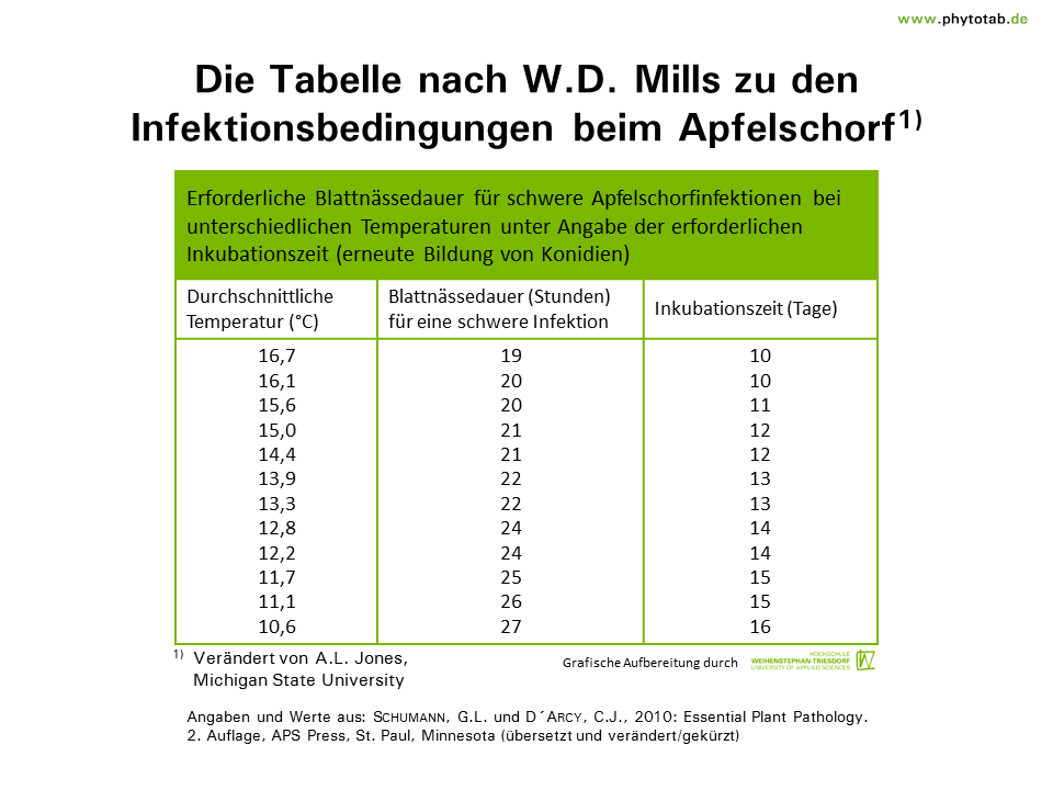 Titel: Die Tabelle nach W.D. Mills zu den Infektionsbedingungen beim Apfelschorf