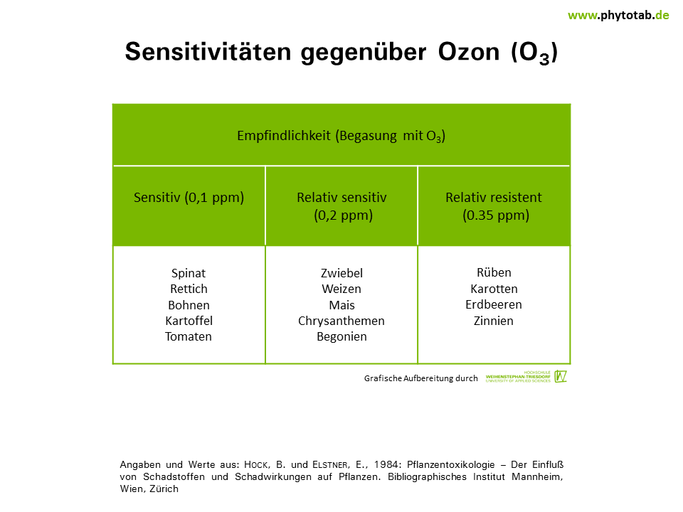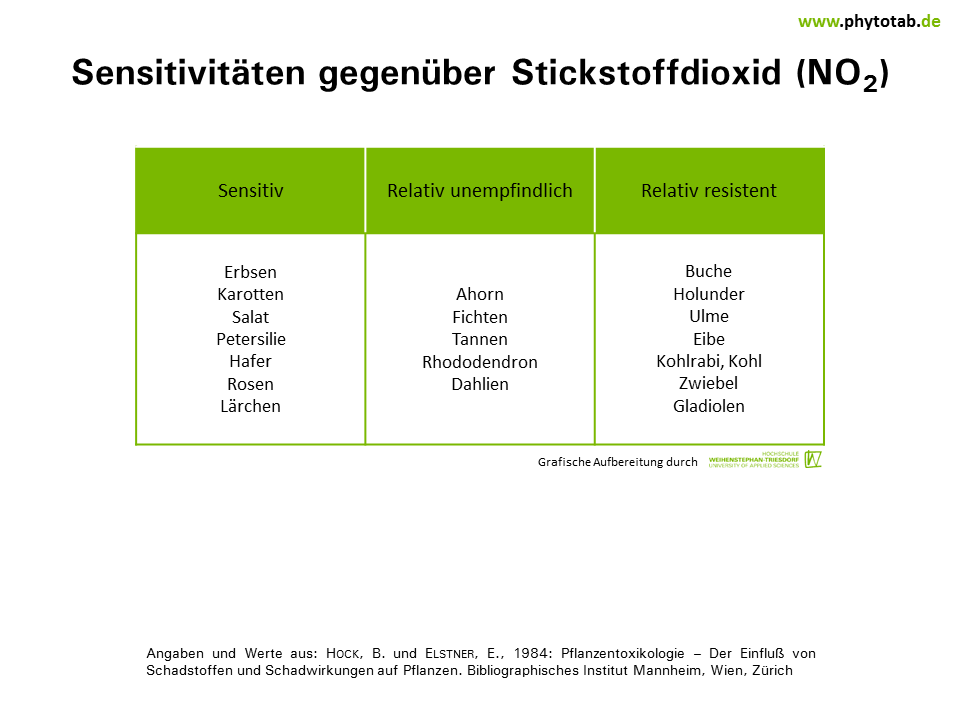 Quellen: Hock, B. und Elstner, E., 1984: Pflanzentoxikologie – Der Einfluß von Schadstoffen und Schadwirkungen auf Pflanzen. Bibliographisches Institut Mannheim, Wien, Zürich