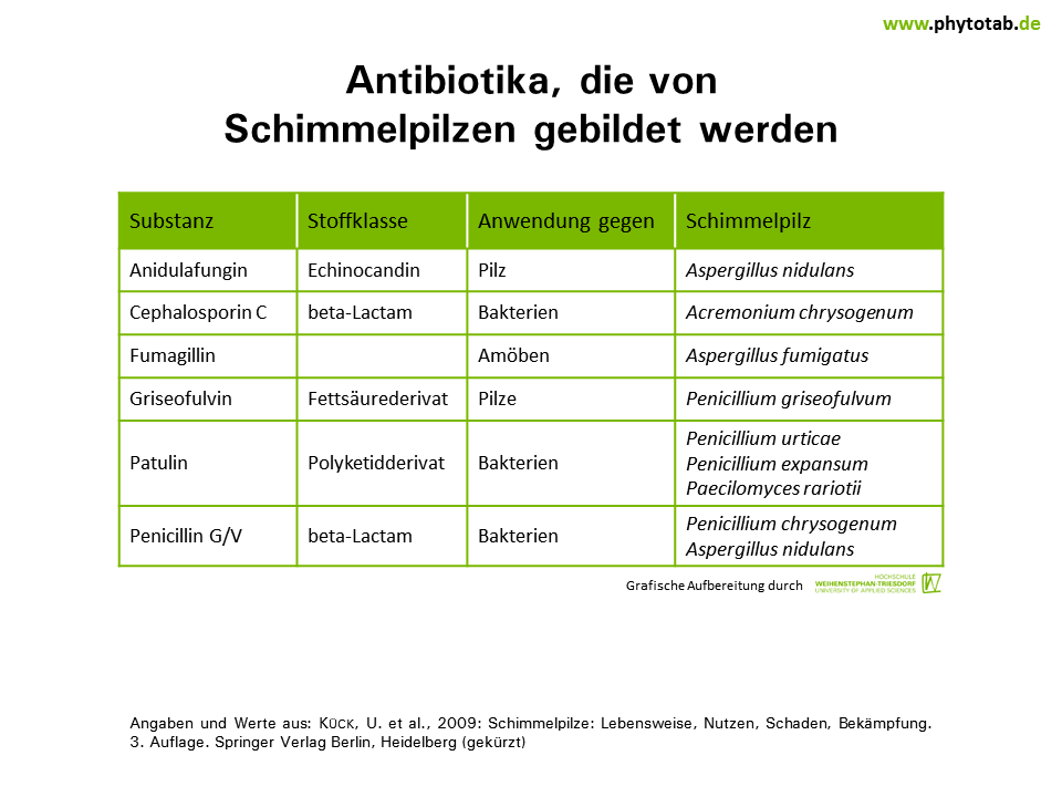 Quellen: Kück, U. et al., 2009: Schimmelpilze: Lebensweise, Nutzen, Schaden, Bekämpfung. 3. Auflage. Springer Verlag Berlin, Heidelberg