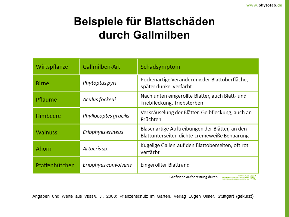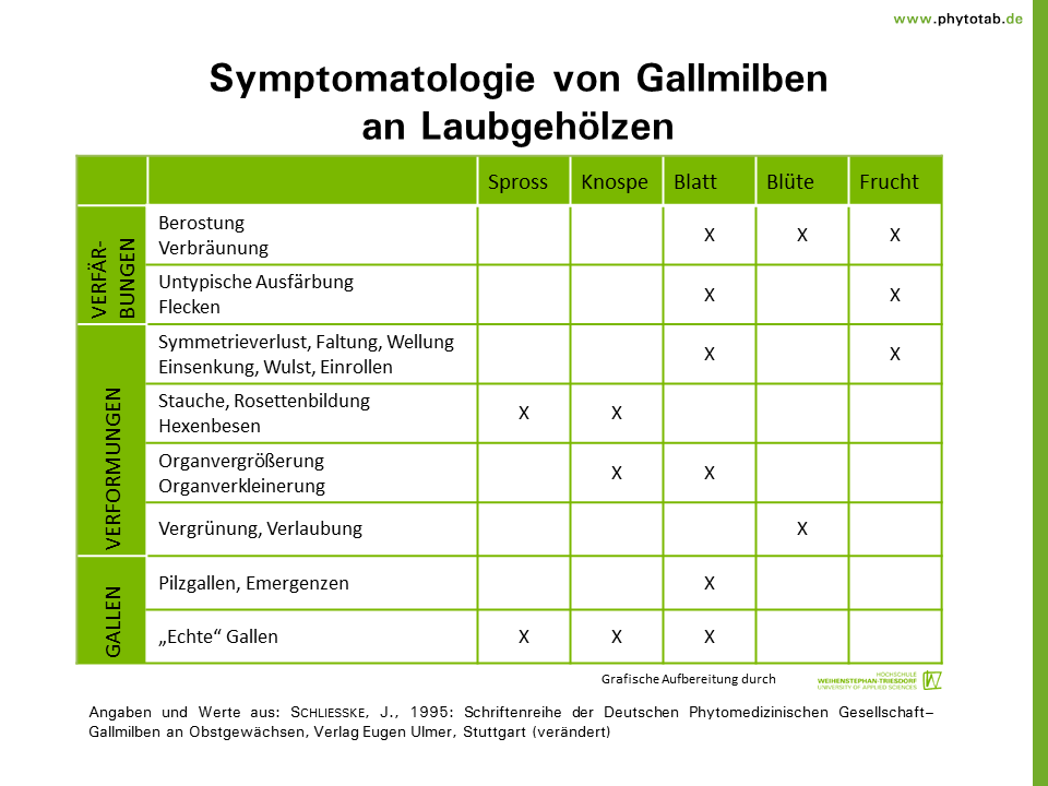 Quellen: Schliesske, J., 1995: Schriftenreihe der Deutschen Phytomedizinischen Gesellschaft – Gallmilben an Obstgewächsen, Verlag Eugen Ulmer, Stuttgart
